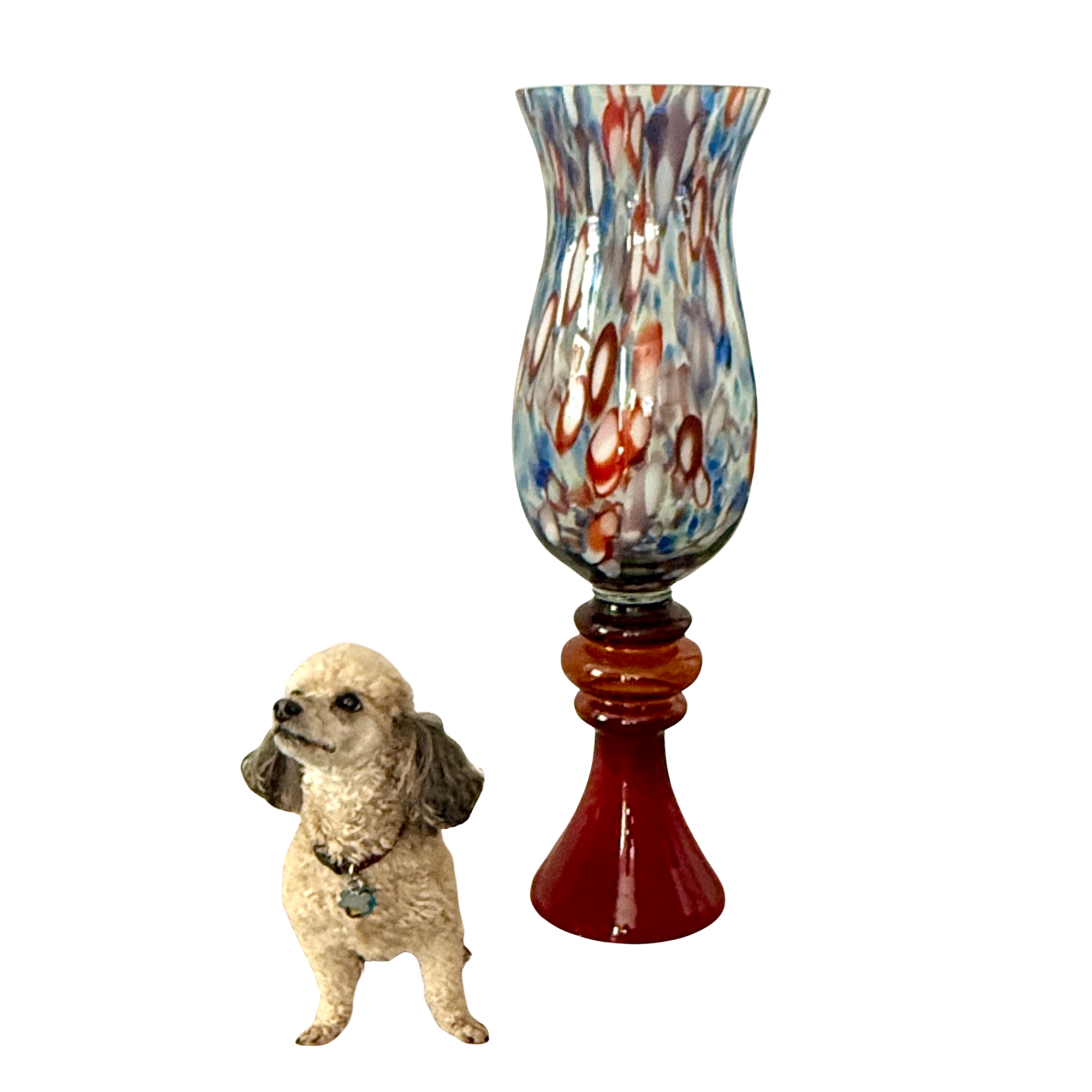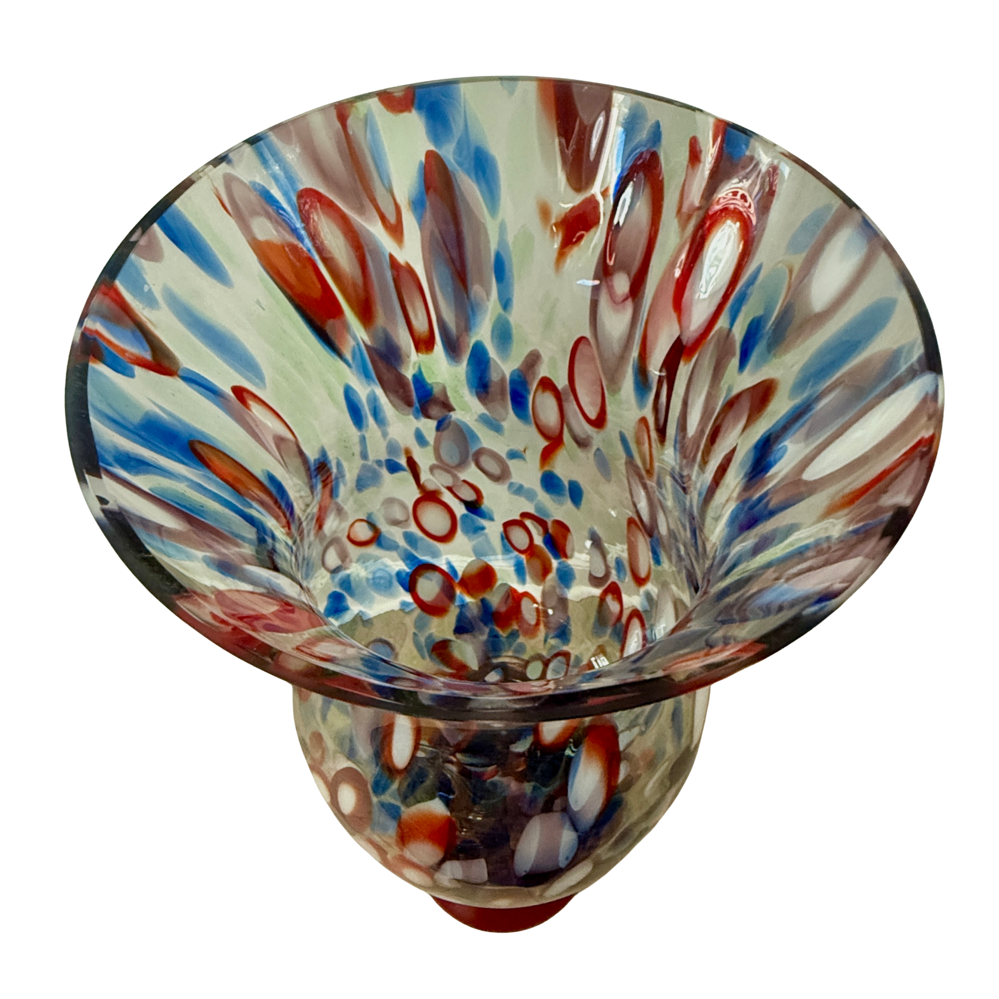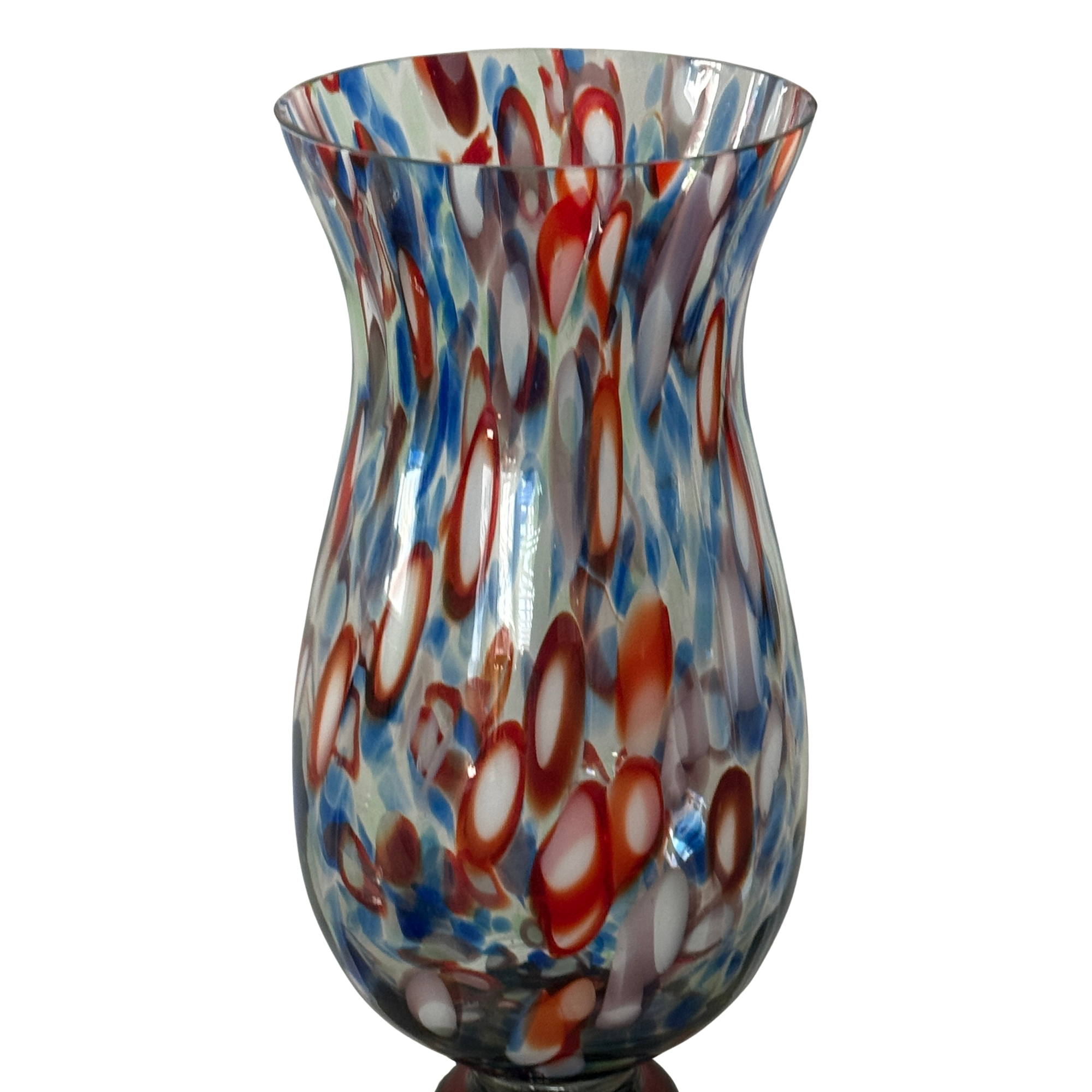 A fine monumental Italian glass vase, circa 1970. The vase is blown with a clear well with a loose millefiori decoration in vibrant colors. The base is in a rich red. Condition is very good. Dimensions: Height 27”, Width 11”.
