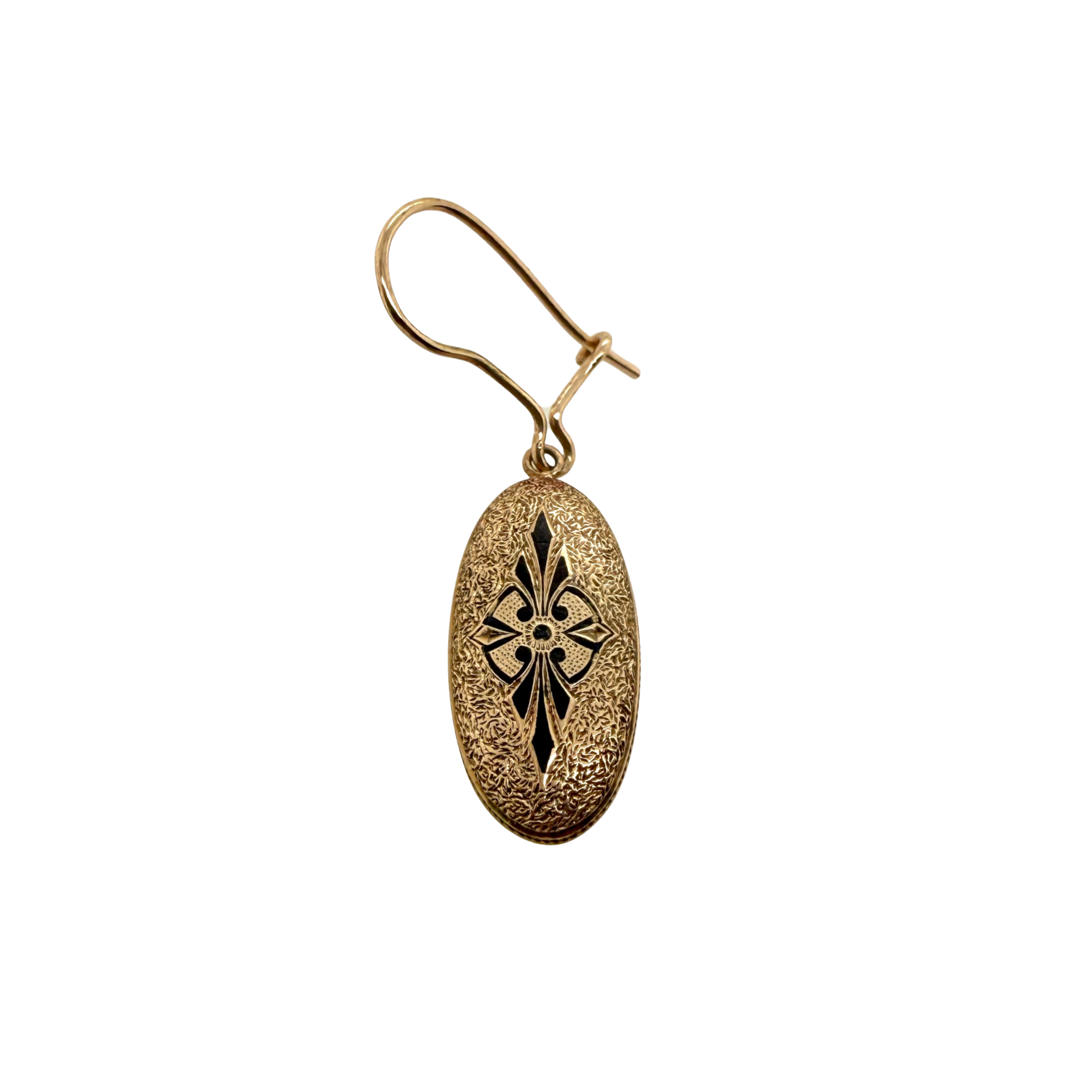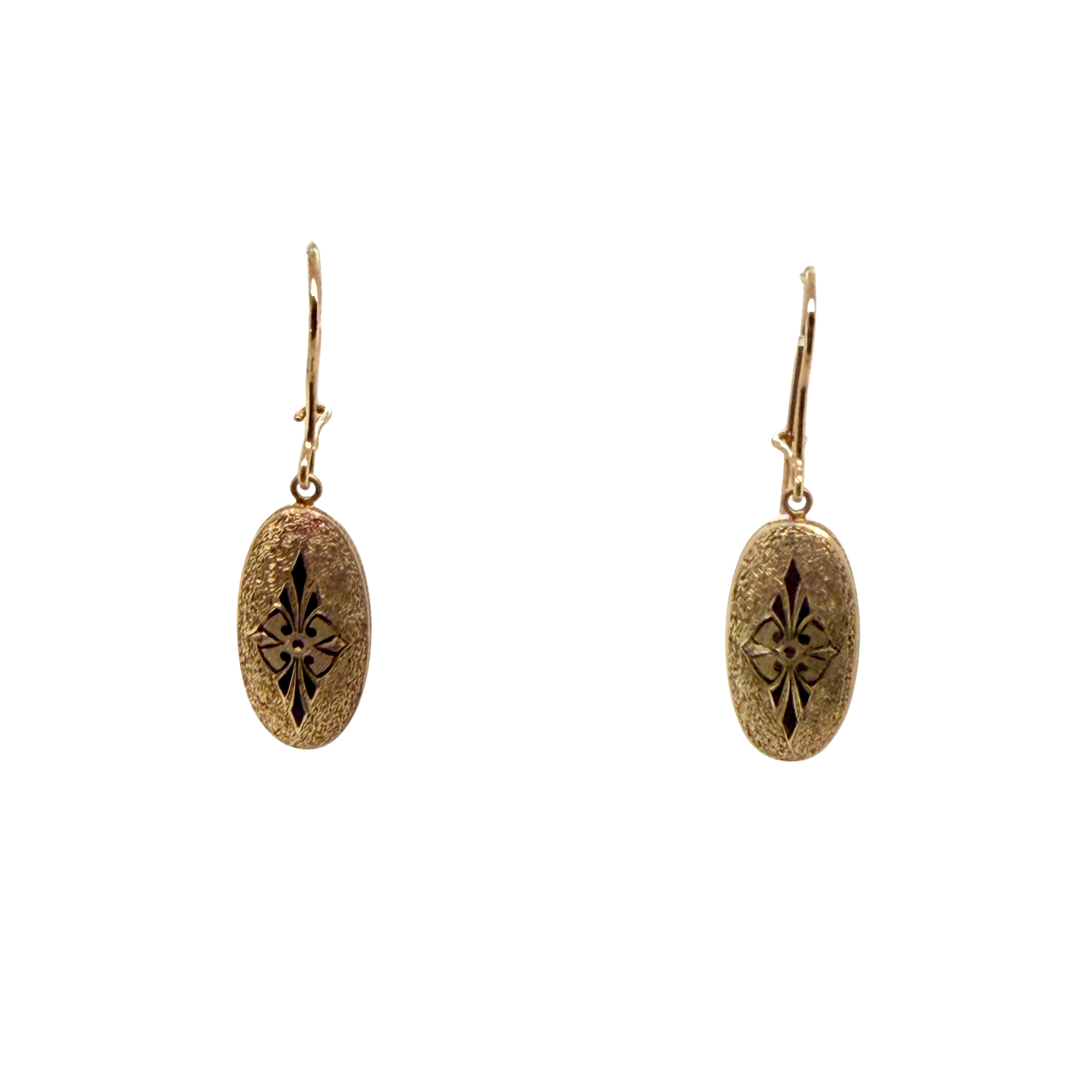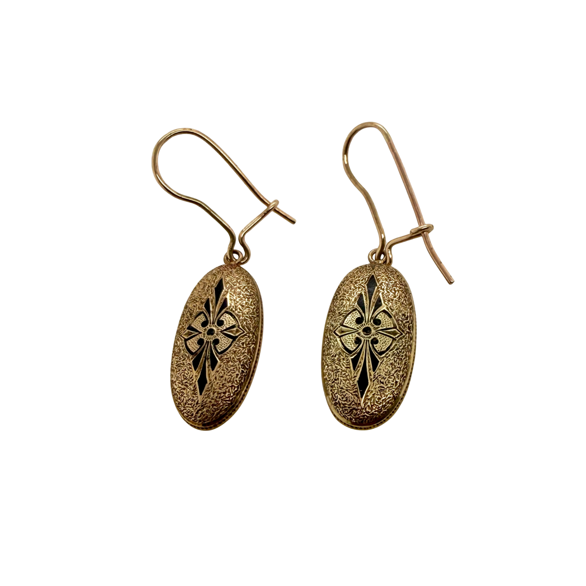 A fine pair of Victorian period earrings with Taille d'epergne enameling on a stippled ground.  The earrings were repurposed from cufflinks.  They date c. 1880 and they test 14K.  The French wires are 14K and are contemporary.  Condition is excellent.