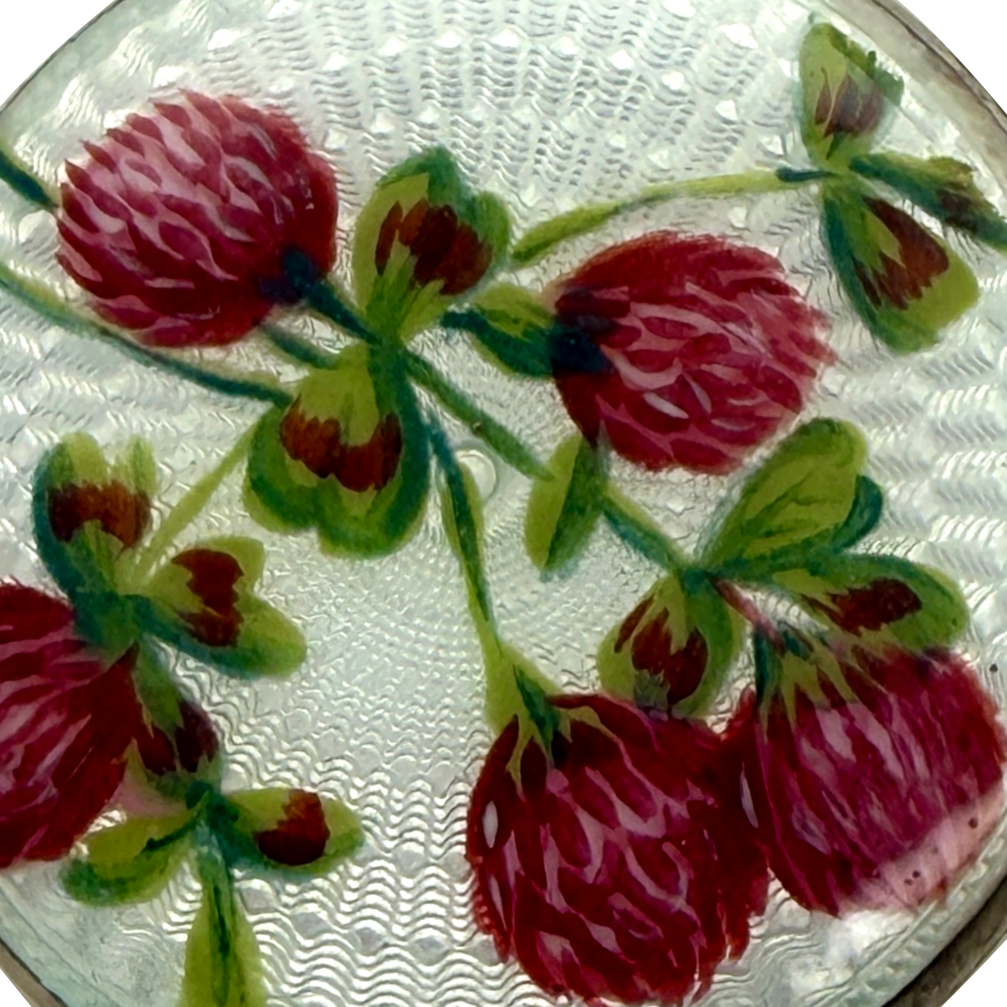 A fine Edwardian silver locket in guilloche enamel decorated with red clover blossoms. There are no marks, but the pendant tests silver. The piece dates c. 1915 and is possibly of Austrian, Swiss or Scandinavian origin, where clover motifs were popular for good-luck symbolism. The locket does not have its original picture covers but it closes tightly. Condition is good with some minor repair to one of the white edges which is not noticeable unless using a jeweler's loupe.