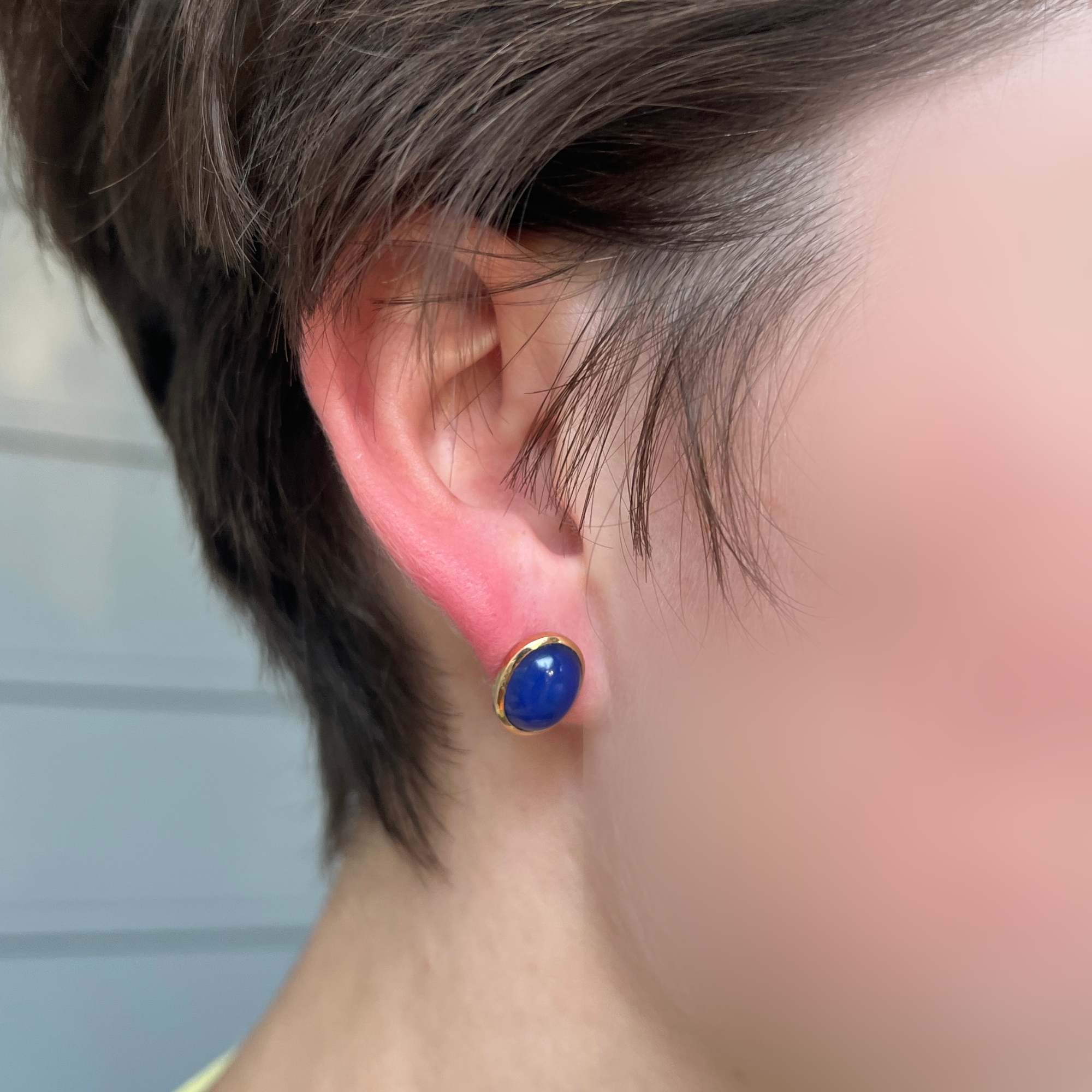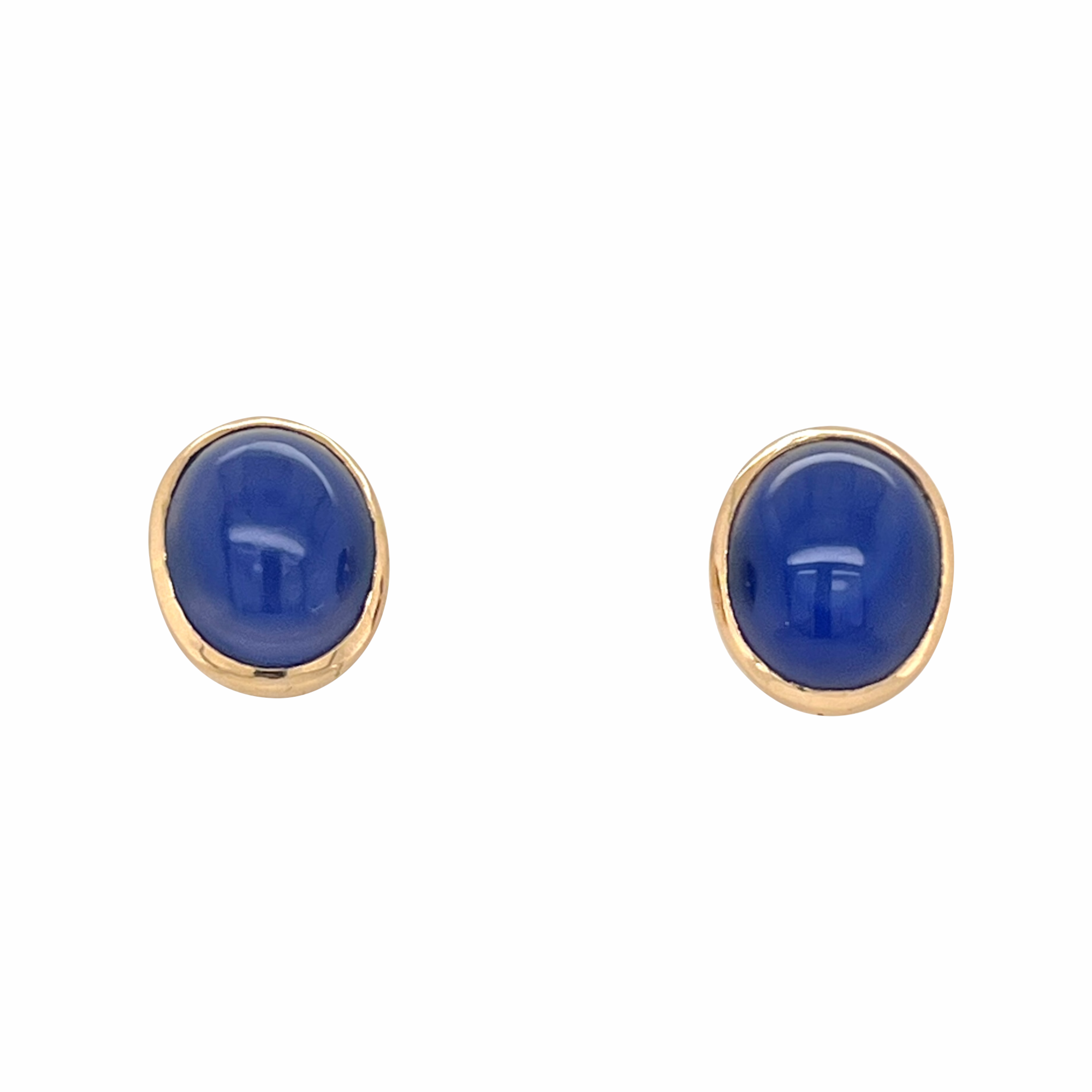 A fine pair of 14K yellow gold earrings with bezel set cabochon polished blue chalcedony stones. The earrings have pierced posts and gold butterflies. One of the earrings is faintly marked 14K and they also test 14K gold. Condition is excellent.