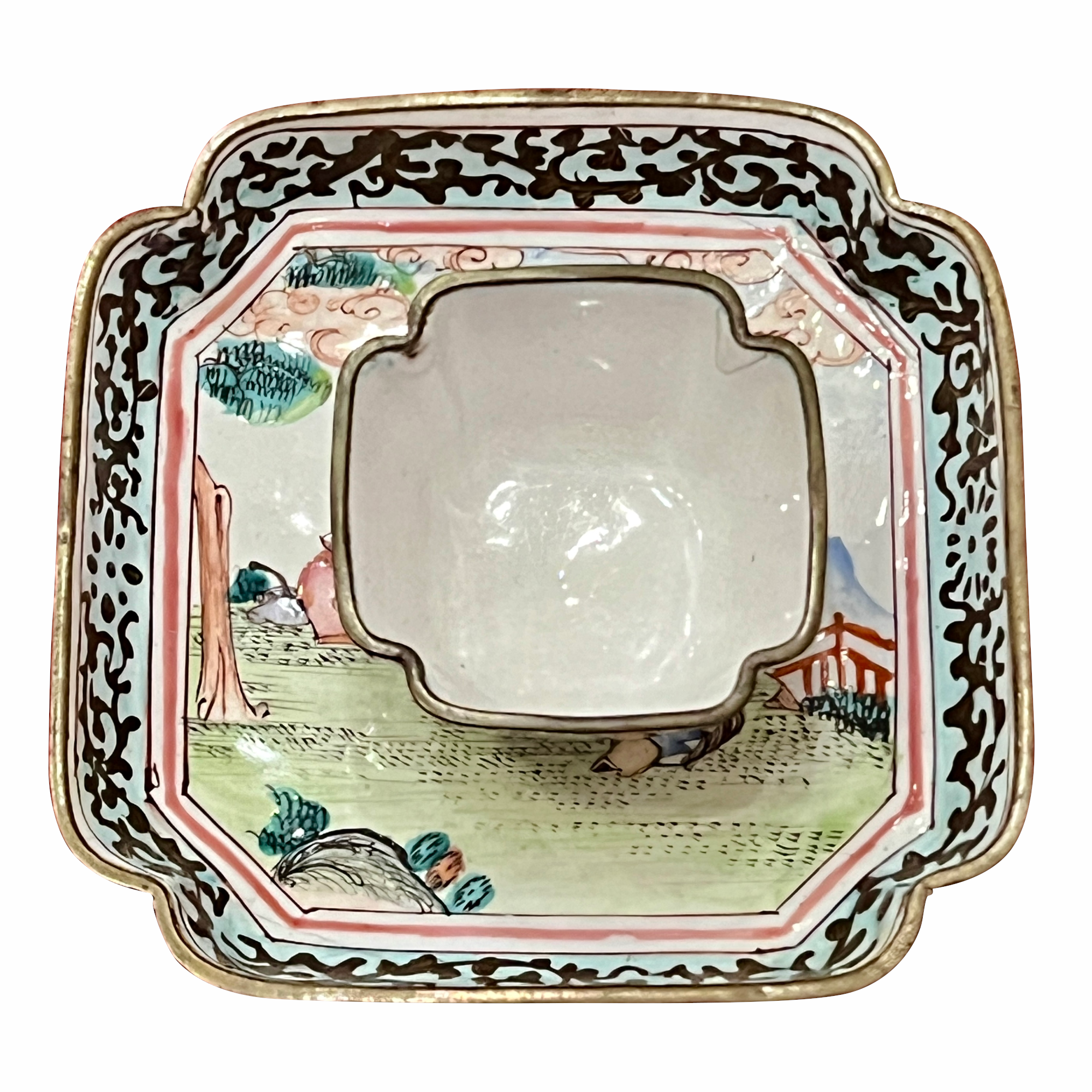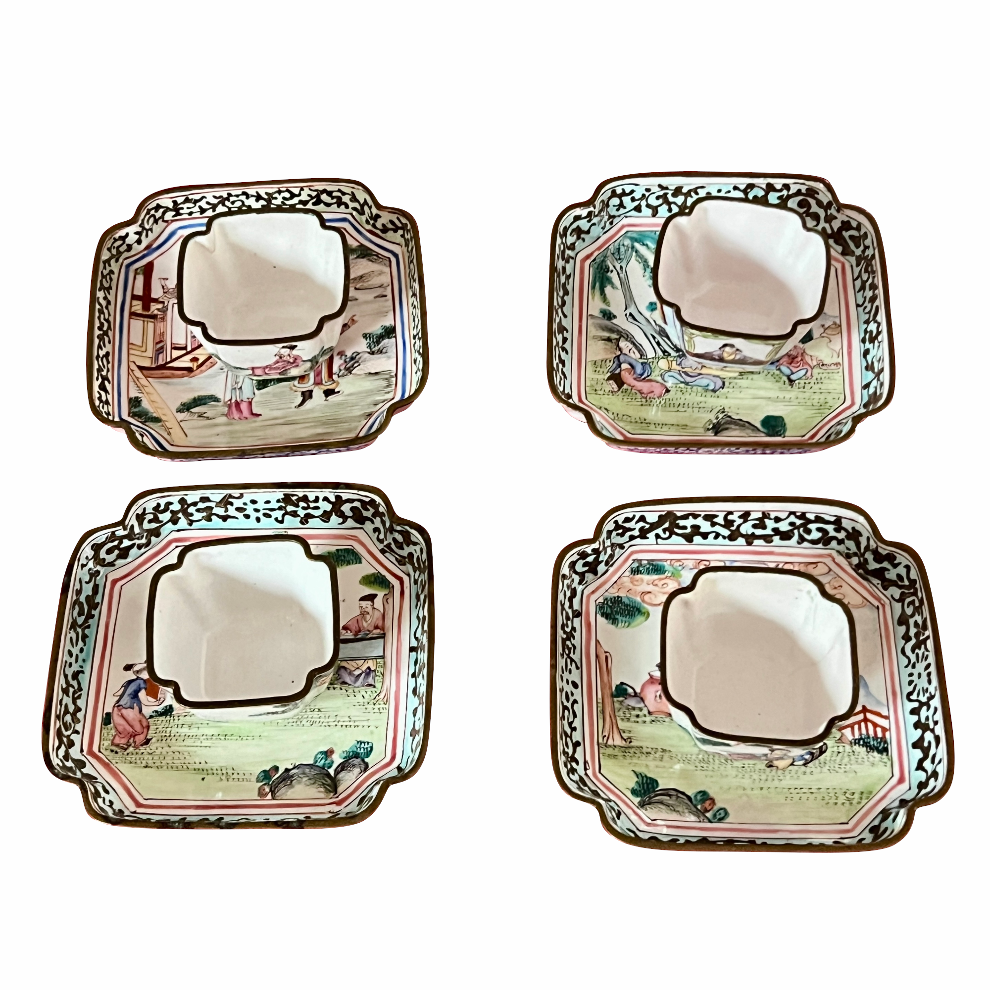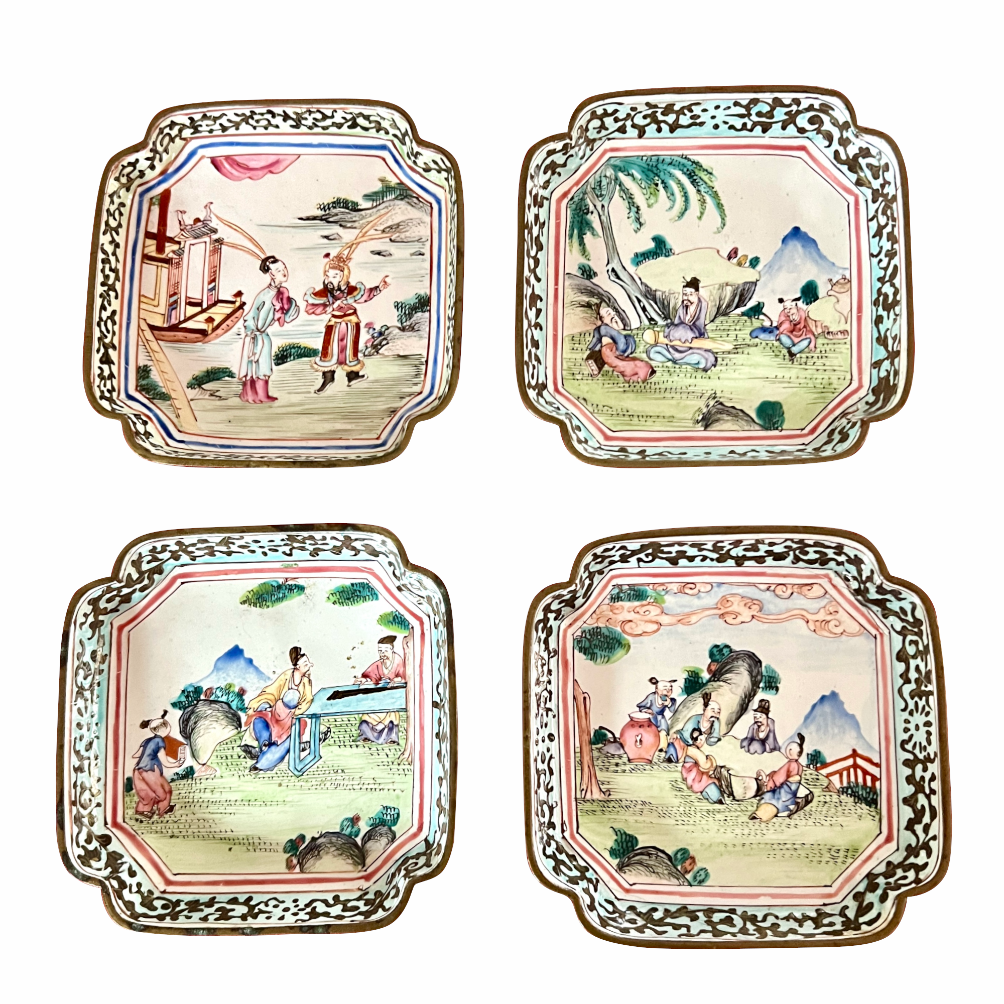 A set of four antique Chinese Canton enamel small cups and under plates. Each cup and plate is painted with scenic images with figures and landscape. Condition is very good. Dimensions: Height 1.25”, Depth 1.25”, Width 1.25”. Plate Height .75”, Depth 3.75”, Width 3.75”.
