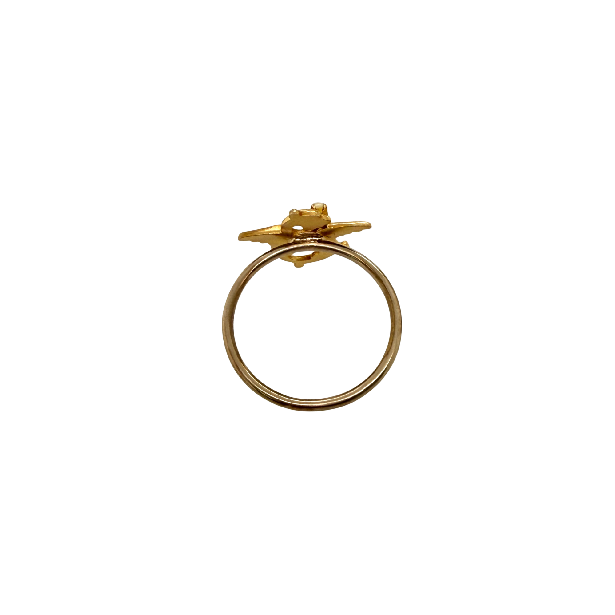 A wonderful 14K gold ring in the form of a griffin holding a seed pearl. Originally a stickpin, a 14K gold shank has been added. The shank and the top tests 14K, they are not marked. Condition is excellent.