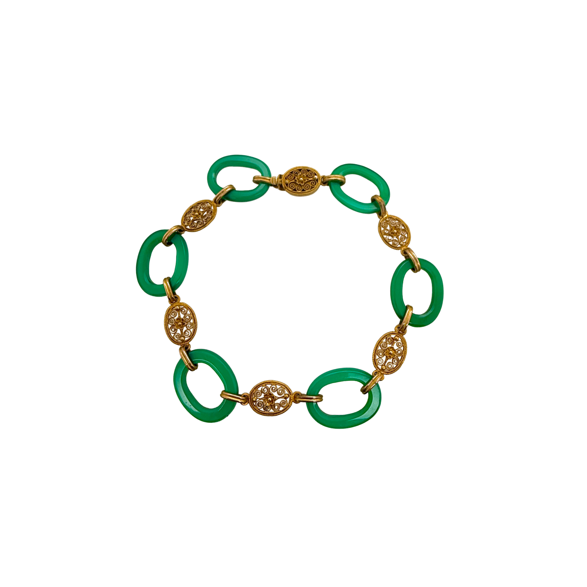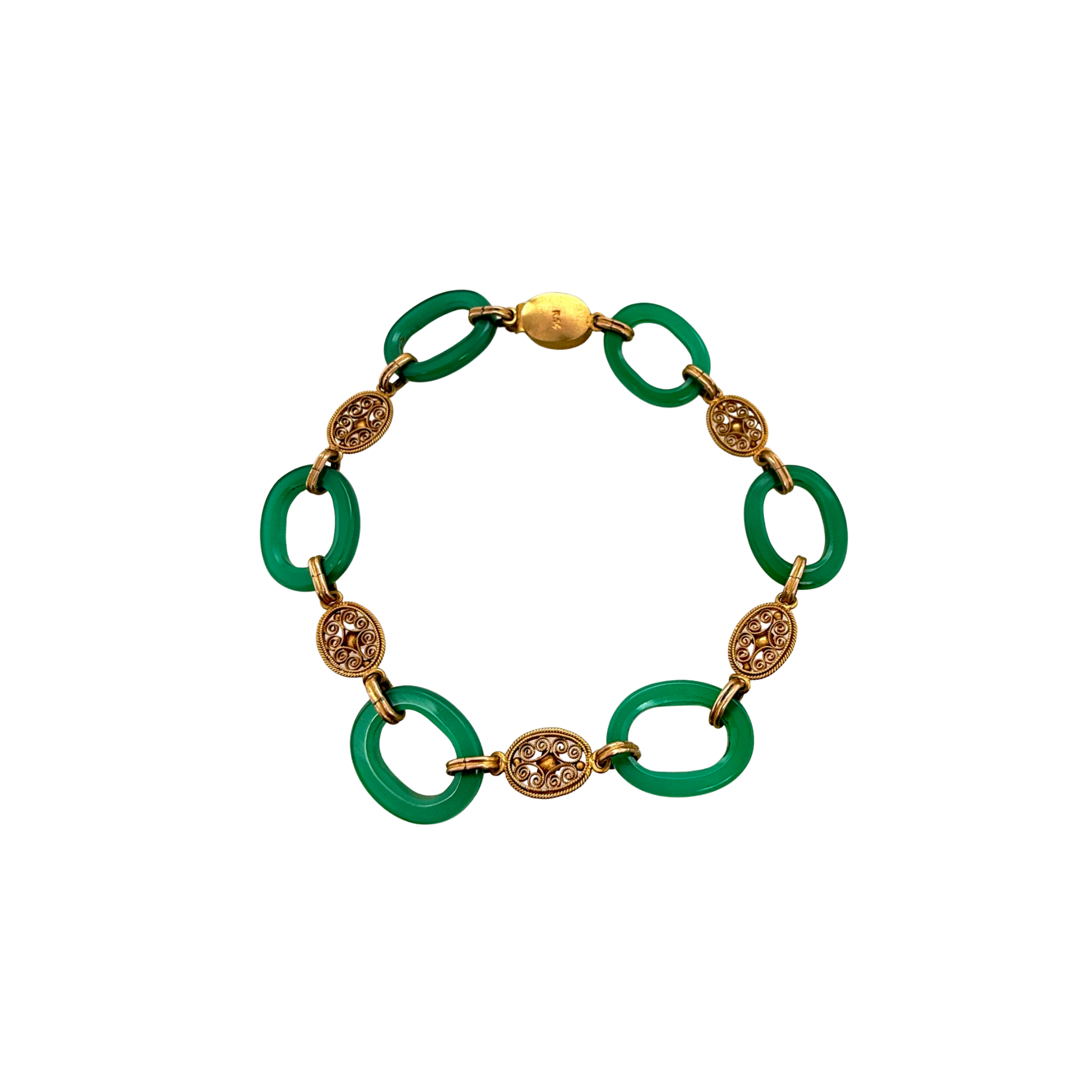 This is a fine Art Deco inspired bracelet that blends vivid color with elegant gold detailing.  The bracelet is composed of alternating translucent green chrysoprase oval links and intricately engraved 14K gold oval connectors.  Condition is excellent.  It is marked K.14 on the back of the clasp.
