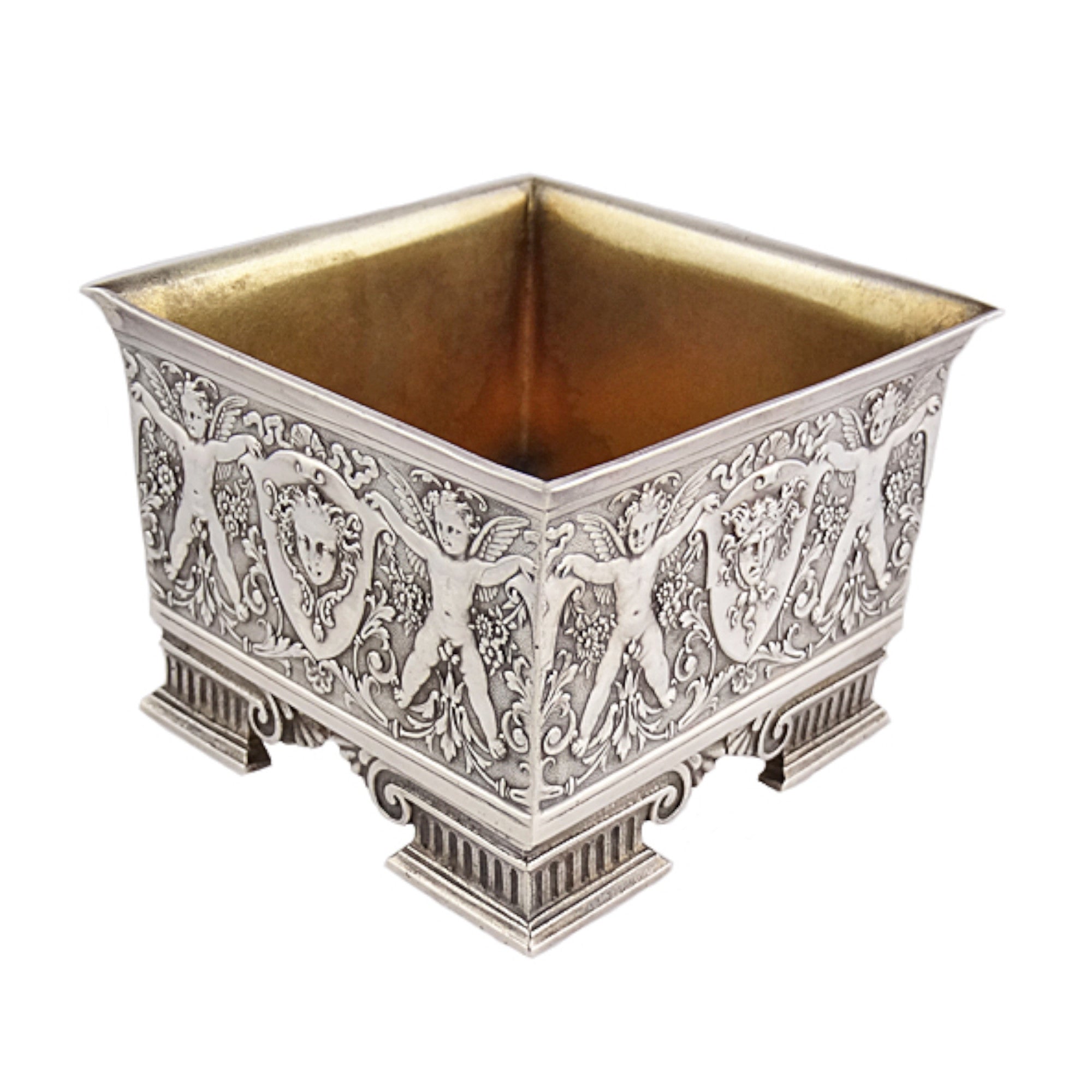 A fine and beautiful pair of Victorian sterling silver salts circa 1865. Each square is in form and decorated in a Renaissance Revival Style with winged cherubs surrounded by scrolling vines and flowers. Between the cherubs are two types of facial masks, the first a female with projecting hair and the second, a male with a head draped with an animal skin hood. The salts rest on ionic capitals which form the feet. They are stamped " English Sterling". The maker is John Wendt of New York. The number 469 also appears. The interiors retain the original gilded surface. The condition is very good.