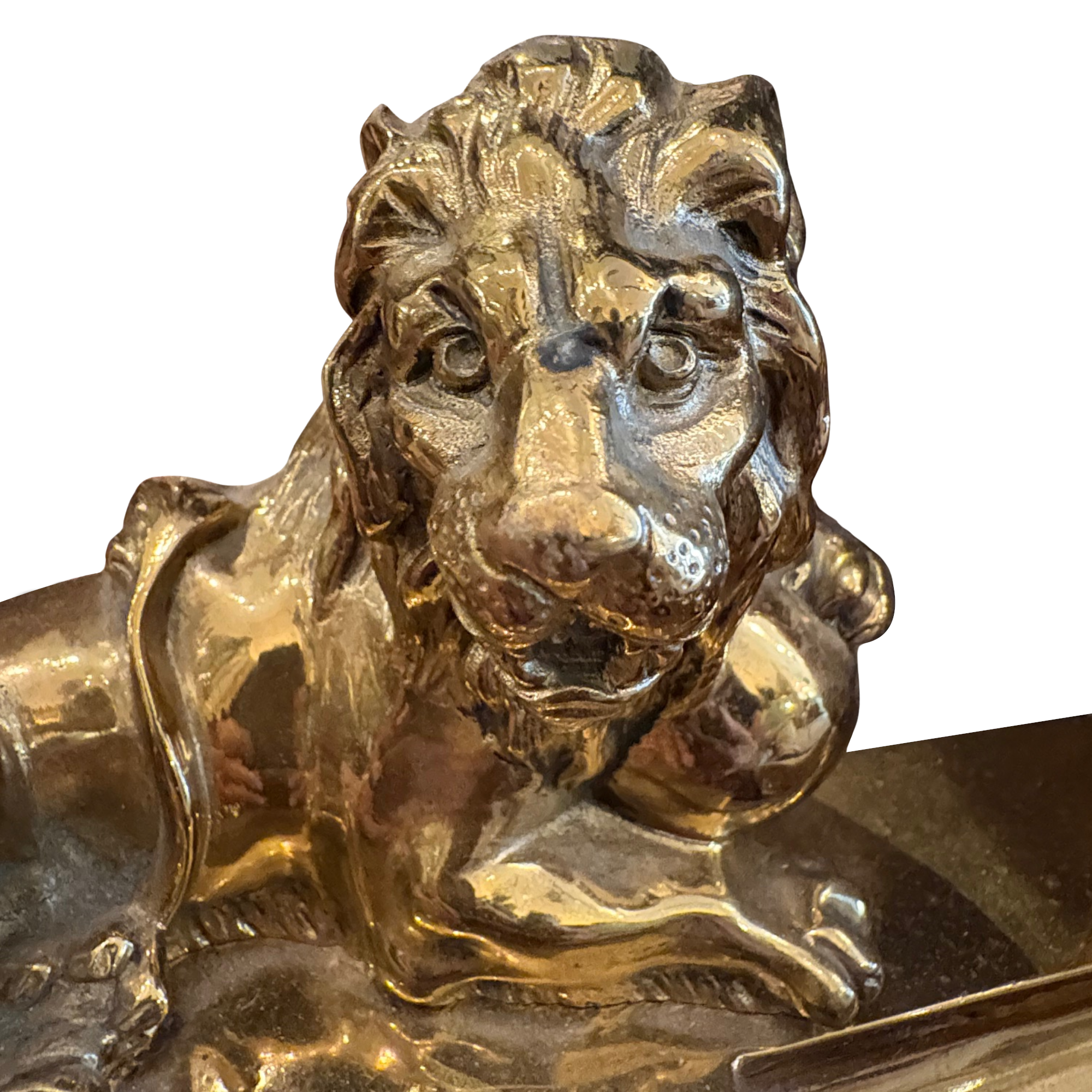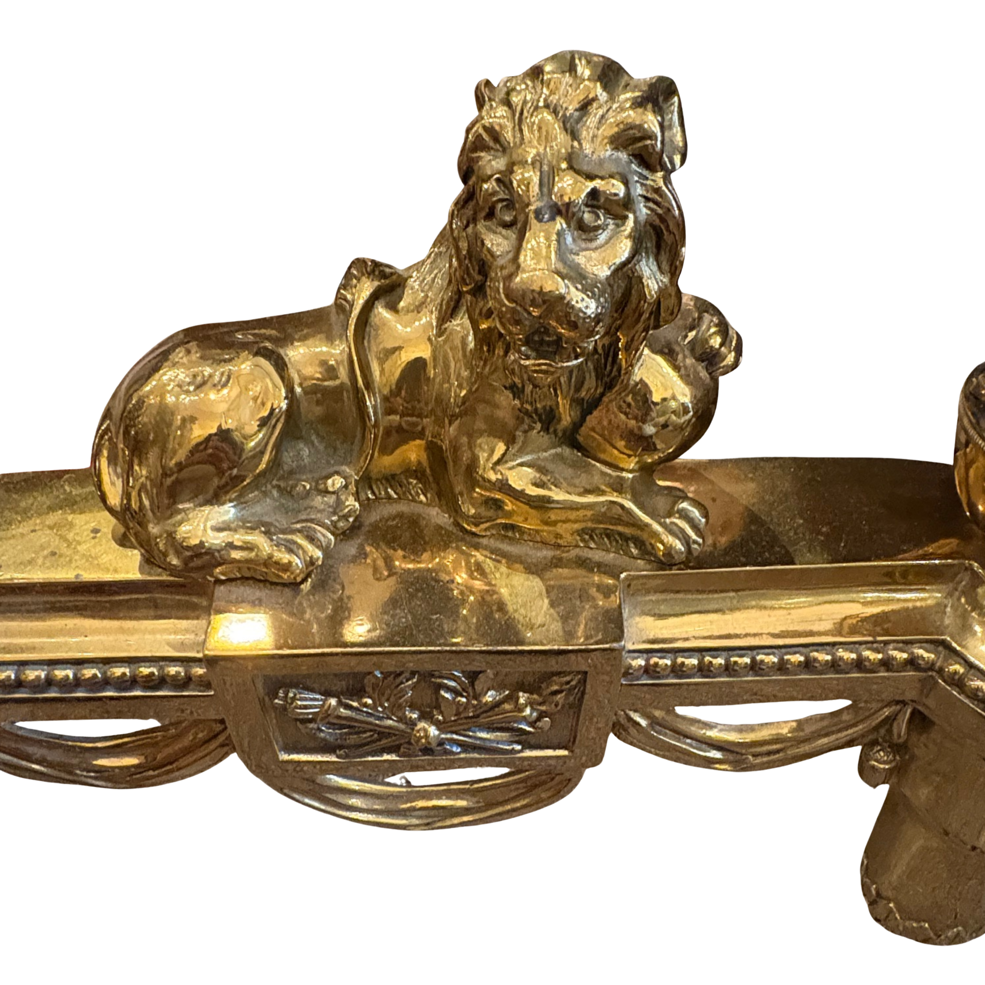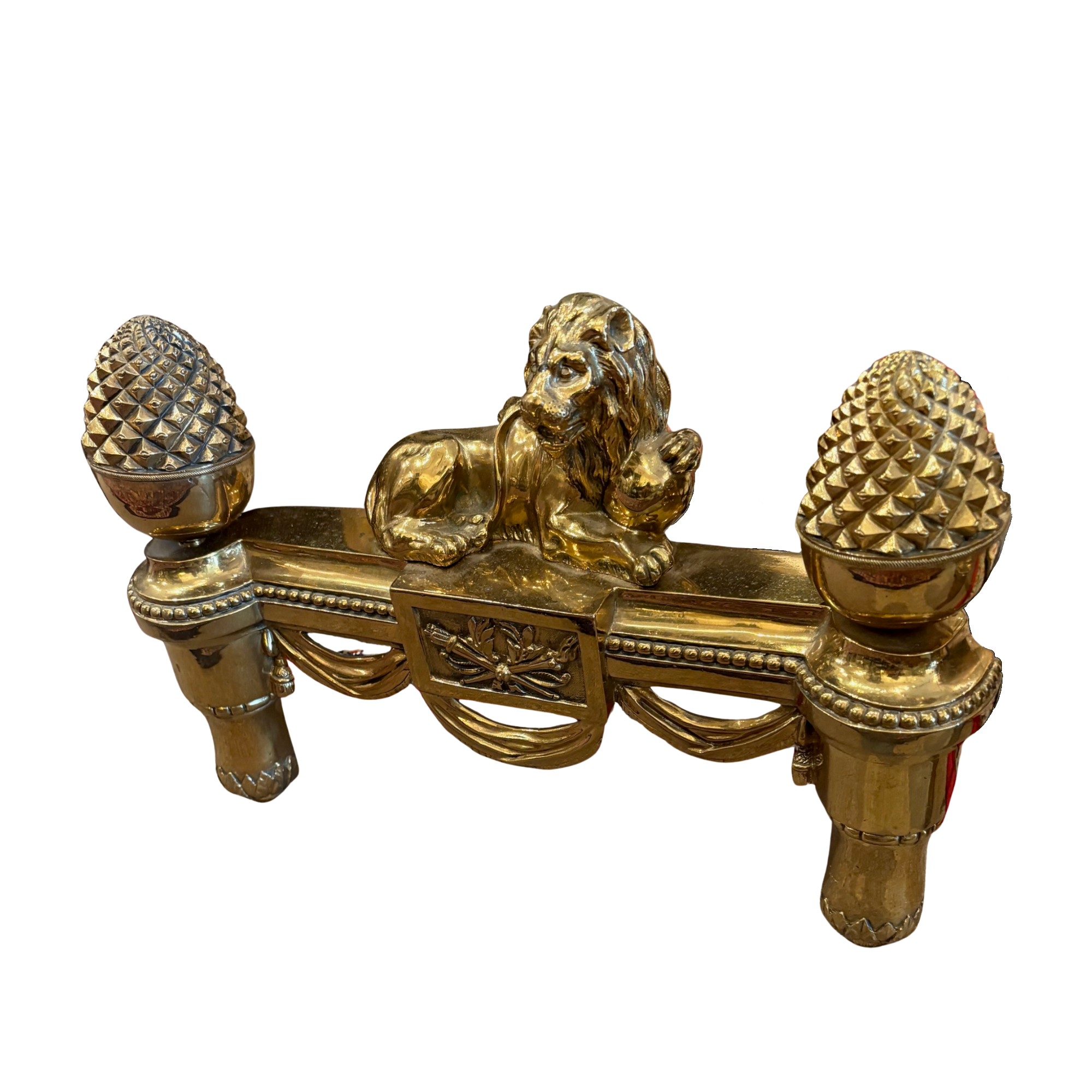 A fine pair of nineteenth century French brass chenets, circa 1880. The pair decorated with lions flanked with pineapples. There are swags just below and the pair have short turned legs. Condition is very good.