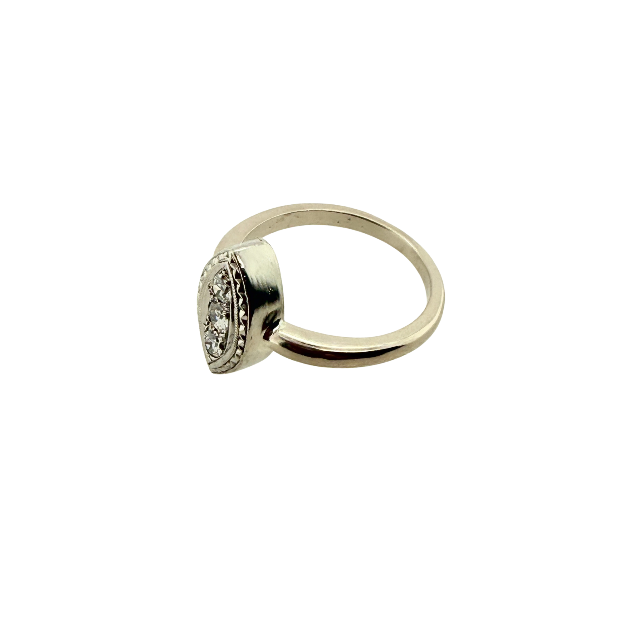 A fine vintage 14K white gold and diamond navette ring. The ring is set with three .8 ct diamonds with an engraved bezel (TDW approximately .25 ct) . The back of the ring is latticed openwork. The ring and shank test 14K but are not marked. Condition is excellent.