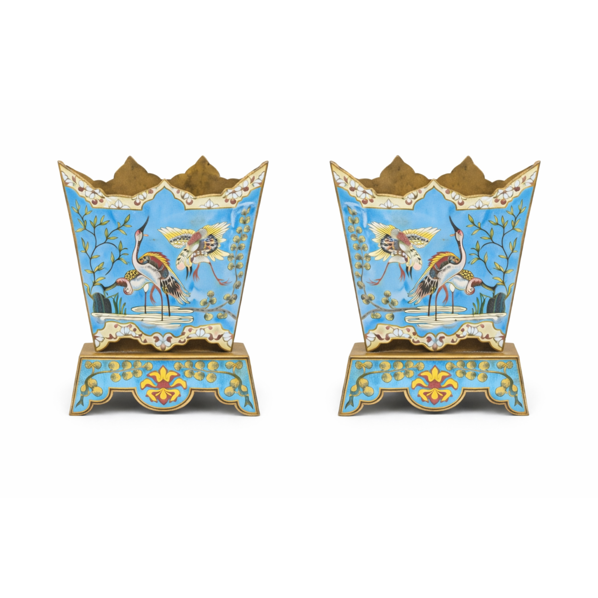 A fine pair of Chinese 19th Century Cloisonne jardenieres circa 1880. The jardenieres with a light blue primary ground have scenic decoration with cranes and trees in a marsh. The tops are crenelated. The bases flared and have floral decoration. Condition is very good. Dimensions: Height 8.5”, Width 7”.
