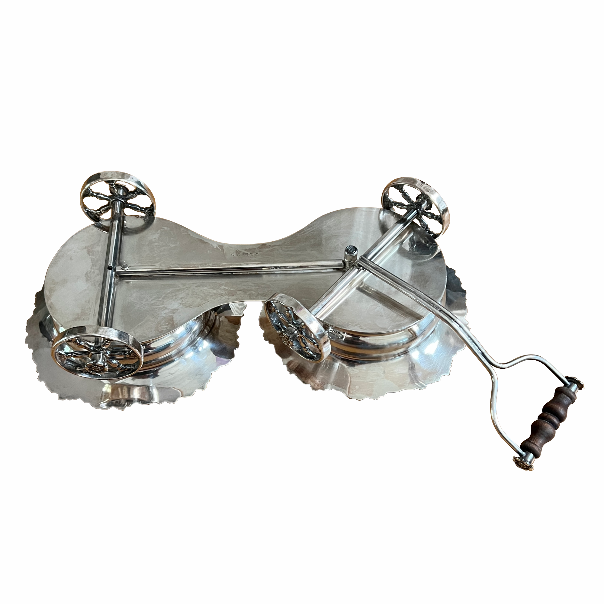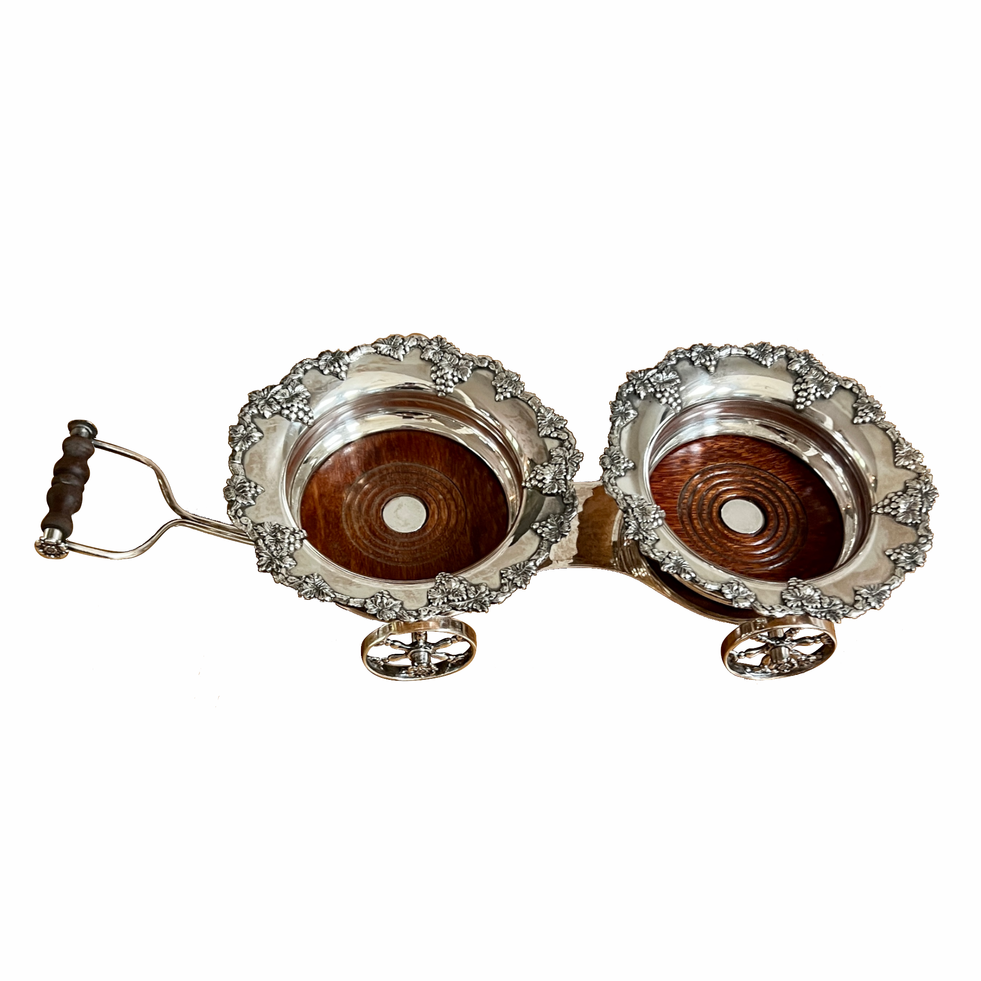 A fine late 19th century plated silver table wine trolley circa 1880. The carriage form trolley with a pull handle and two wine coasters above four elaborate spoked wagon wheels. The coasters are decorated with grape leaf borders in high relief and fitted with wooden foundations centered with a plated center button. Condition is very good.